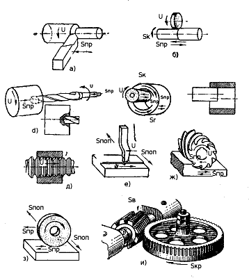 Плоские поверхности обрабатываются строганием (рис. 247, е), фрезерованием (рис. 247, ж) и шлифованием (рис. 247, з) соответственно на строгальном, горизонтально- и вертикально-фрезерных и плоскошлифовальном станках при главном движении резания, направленном по стрелкам V. Фасонные боковые поверхности зубьев (рис. 247, и) при нарезании методом обкатки на зубофрезерном станке получаются при движении резания по стрелке V, выполняемой червячной фрезой; движение подачи по вертикали, сверху вниз, осуществляет фреза Sв, а круговую подачу Sк — заготовка.